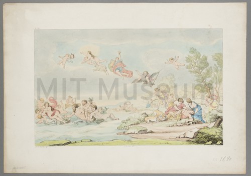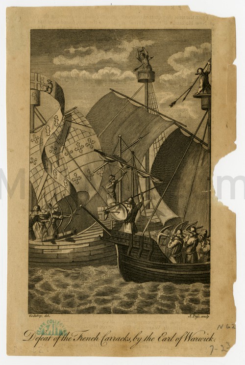 Defeat of the French Carracks, by the Earl of Warwick. Intaligo print depicting two ships drawing up to one another and men …