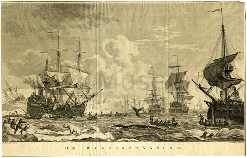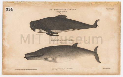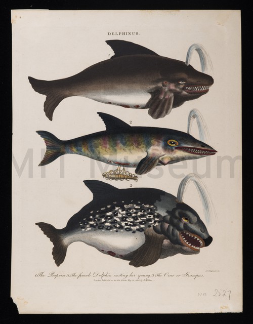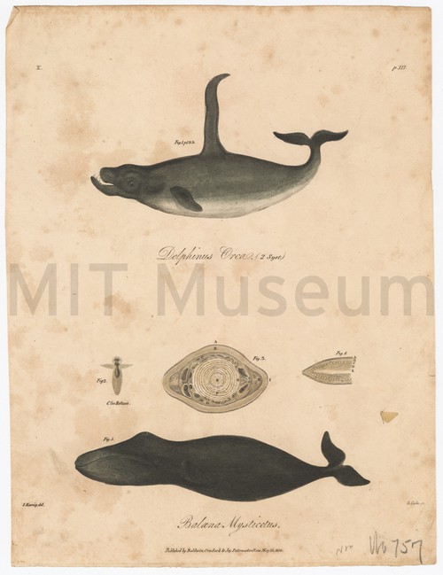 Delphinus Orca, Balaena Mysticetus Colored engraving showing a Delphinus orca, a Balaena mysticetus, and various features …