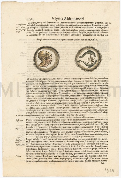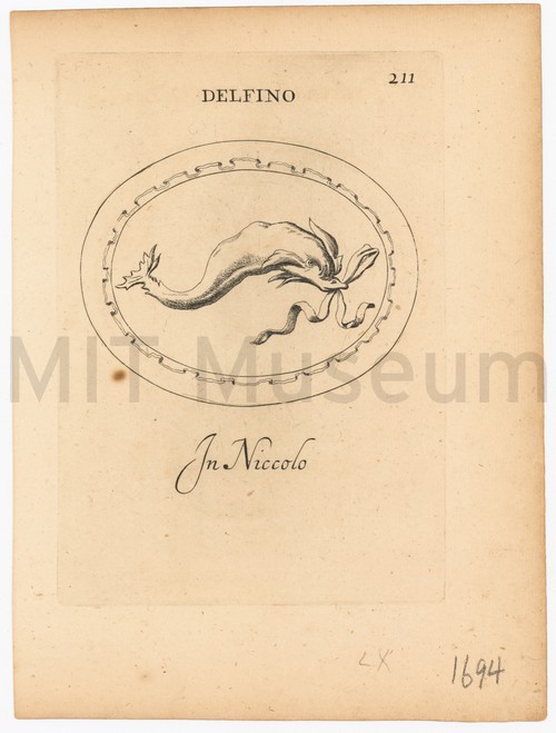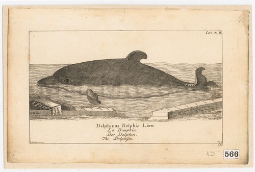 Delphinus Delphis Linn: Le Dauphin. Der Delphin. The Dolphyn. Black and white engraving of the common dolphin. Title in Latin, French, …