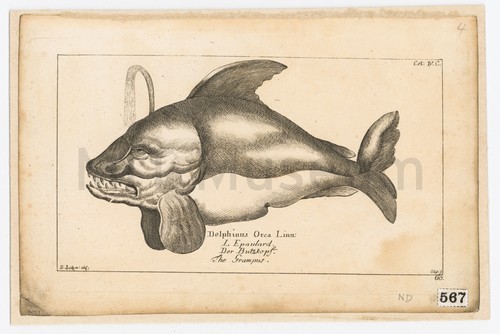Delphinus Orca Linn: L. Epaulard. Der Butzkopf. The Grampus. Black and white engraving and distorted representation of a killer orca whale. …