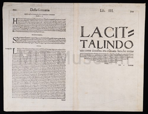 Della Germania. Lindoia citta insulare circondata con acque di laguna. Uncolored woodcut map of the German city of Lindau, which exists on …