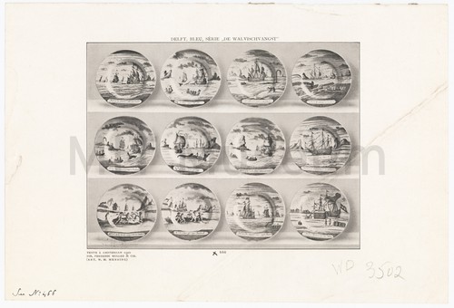 Delft, Bleu, Serie, De Walvischvangst (Photos of plates with whaling scenes) Monochrome print of a photograph. Photograph shows twelve porcelain plates with whaling …