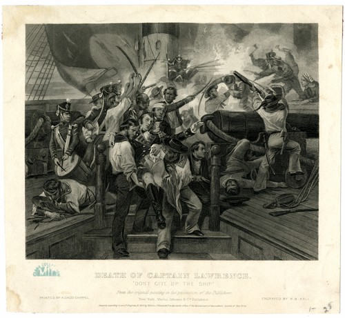 Death of Captain Lawrence. Uncolored engraving depicting men on board ship during a naval battle. At …