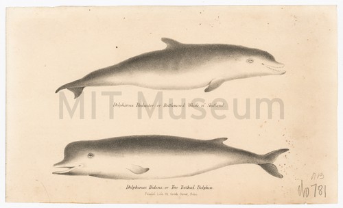 Delphinus Deductor or Bottlenosed whale of Shetland. Delphinus Bidens; or two toothed … Monochrome lithograph of two dolphins. The top dolphin, facing right, is labeled, …