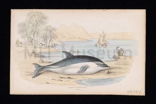 Delphinus Superciliosus Colored engraving of a beached Delphinus Superciliosus. Ship and flightless birds depicted …