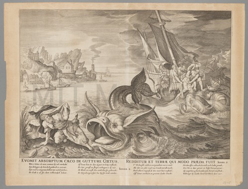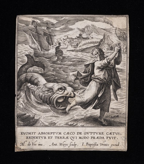 Evomit Absorptum Caeco de Gutture Caetus, Redditur Et Terrae Qui Modo Praeda … This is a small engraving depicting Jonah fleeing from the gaping mouth …