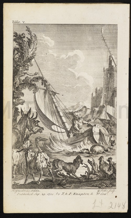 Fable V., The Bear in the Boat The engraving illustrates a scene from John Gay's Fables, the poem entitled …