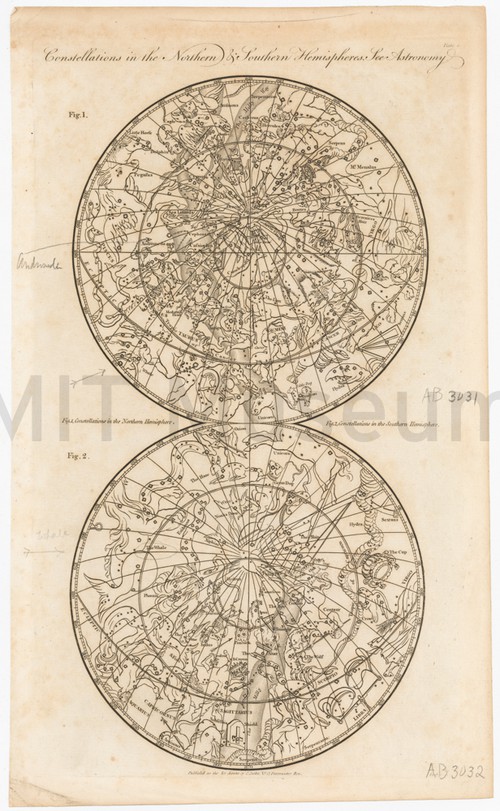 Fig 6. Constellations in Northern & Southern Hemispheres Uncolored engraving depicting the two celestial hemispheres, with the title printed in …