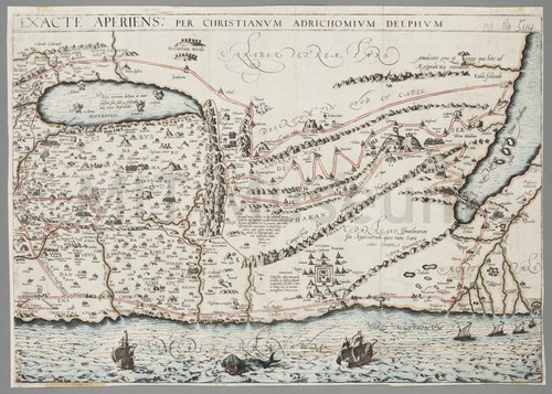 Exacte Aperiens Per Christianum Adrichomium Delphum A section of a hand-colored map of east-oriented Palestine divided into the …