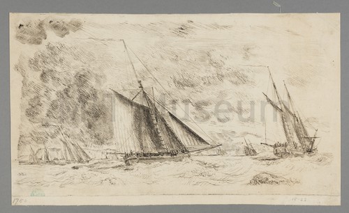 Etching of a Dutch Cutter and Schooner with other shipping An etching of a seascape with a Dutch cutterand schooner. The hatch …