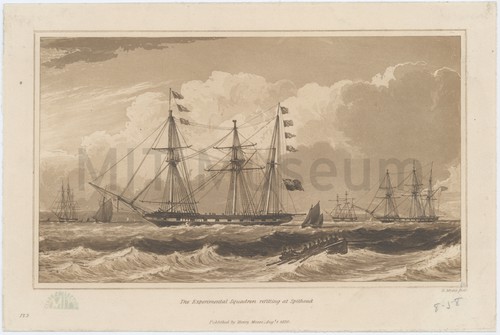 Experimental squadron refitting at Spithead. Etching depicting the ships of the Experimental Squadron off the coast of …