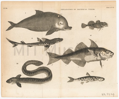 Explanantion of Technical Terms Pl. VII, Vol. III, p. 53 Monochrome image depicting four fishes, labeled II, IV, VI, and V respectively; …