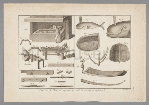 Fanons de Baleine, Operations et outils du Couper de Baleine. Uncolored engraving depicting a series of technical figures relating to the processing …