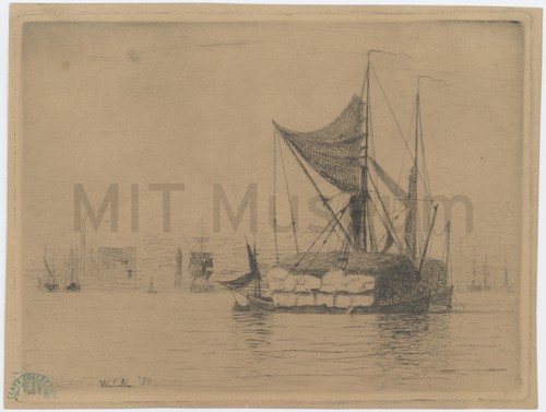 Etching by W.E. Norton Etching depicting a ship laden with large bales, with another ship immediately …
