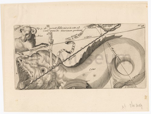 Fig.5-observat: Stellae Mirae in ceto ad Communicat, siverianam pertinens Monochrome astronomical chart depicting the constellations Cetus, part of Aries, and Piscus …