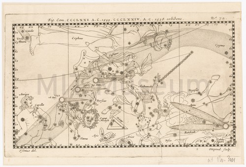 Figura 2 observat, Cometica etc. No.43 Monochrome star chart with several constellations, including Cetus and Andromeda, tracing the …
