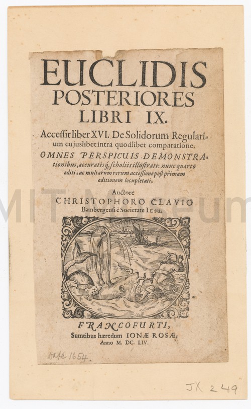 Euclidis Posteriores Libri IX. Title page of a book with a woodcut illustration of Jonah and …