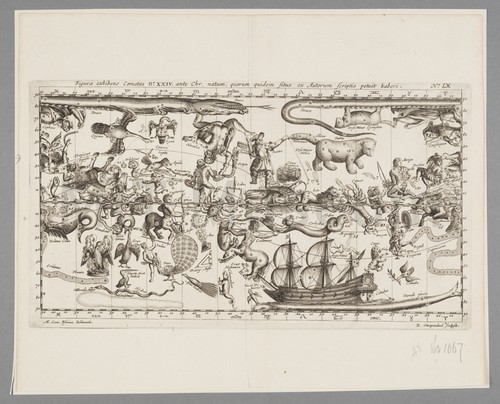 Figura exhiben cometas No. XXIV etc. No LX Book page illustrating an uncolored celestial map, showing both the figural representations …