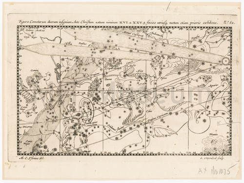 Figura Cometarum duorum infignium Ante Christum natum nimirum XVI, XXV facies utriusque … Monochrome engraving showing the path of two comets, one labeled with an …