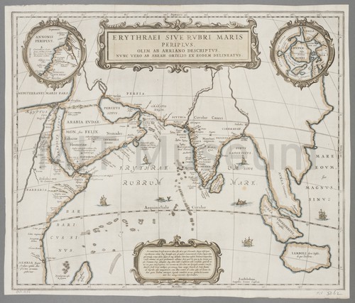 Erythraei sive Rubri Maris periplus, olim ab Arriano descriptus, nunc vero ab … A hand-colored map of the region surrounding the Indian Ocean, or Erythraean …