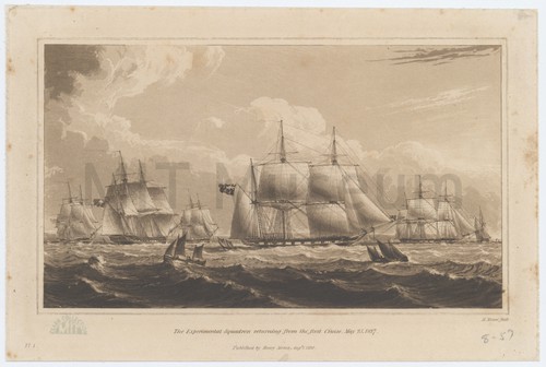 Experimental squadron returning from the first cruise. May 25. 1827. Depiction of the ships of the Experimental Squadron, side view. Vessels are …