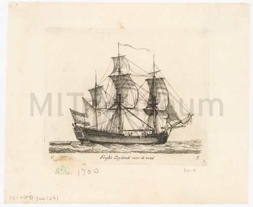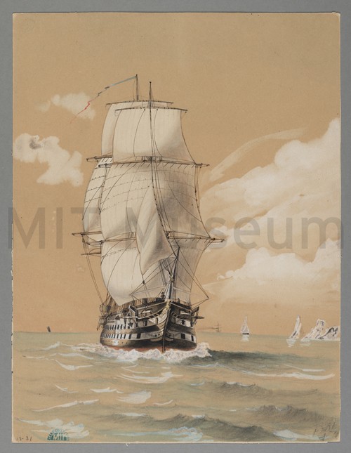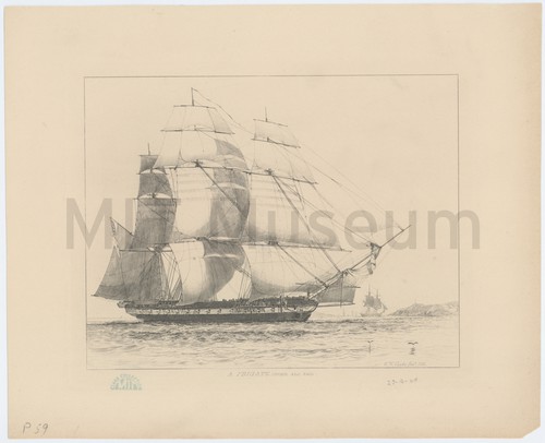 Frigate "Essex" 32 guns, Built in Salem 1799. Colored print reproducting a painting of a three-masted frigate with a single …
