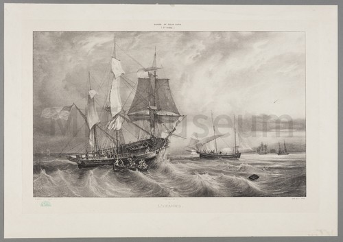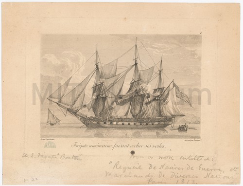Fr̩gate am̩ricaine, faisant secher ses voiles. Side view ship portrait, uncolored, of an American frigate; vessel flies American …