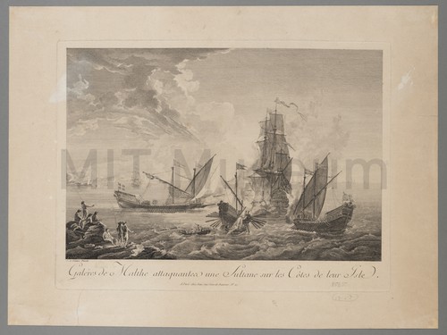 Gal̩res de Malthe attaquantent une Sultane sur les C̫tes de leur Isle Engraving after a painting by Pierre-Jacques-Antoine Volaire, depicting Maltese galleys encircling and …
