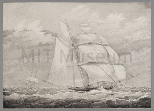 Frigate Chasing American Ship A lithograph possibly depicting a frigate of the West African Squadron chasing …