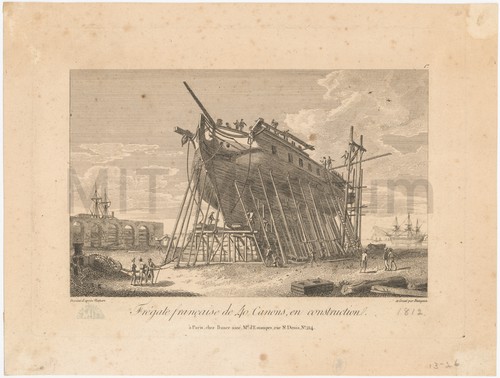 Fr̩gate francaise de 40 Canons, en construction. Uncolored engraving depicting a ship under construction, seen in three-quarters bow view, …