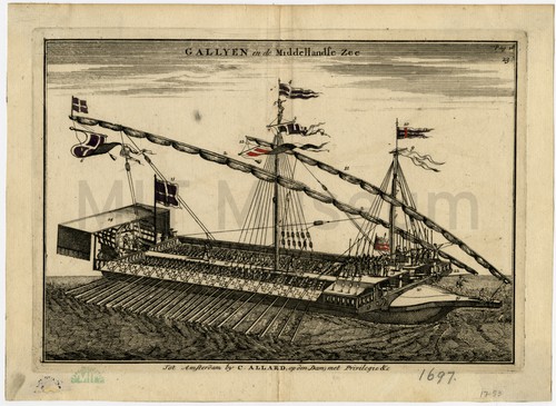 Gallyen in de Middellandse Zee Engraving depicting a galley filled with oarsmen, seen from the side and …