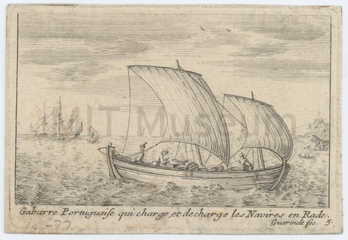 Gabarre Portugaise qui charge, et decharge les Navires en Rade. Engraving depicting a side view of a Portugese gabarre. With title, number …