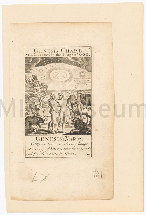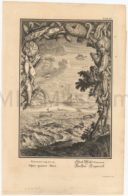 Genesis Cap. I.v.21 Opus Quintae Diei Uncolored engraving depicting fishes in the sea, as well as whales. There …