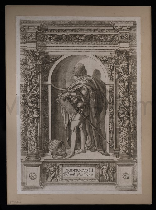 Fridericus III. Feltrius Urbini Dux. Engraved portrait of Frederick II in armor, in an elaborate border. On …