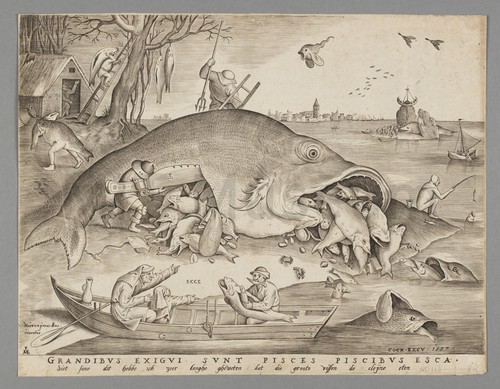 Grandibus Exigui Sunt Pisces Piscibus esca Engraving illustrating the proverb "Grandibus Exigui Sunt Pisces Piscibus esca", "Small fish …