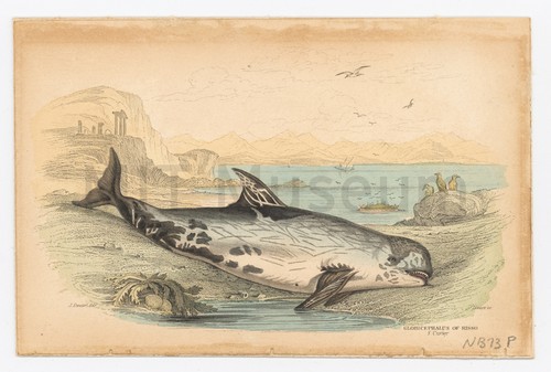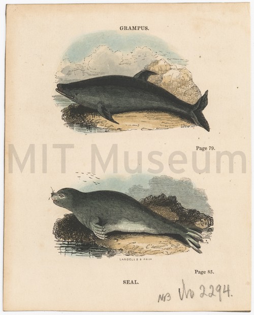 Grampus and Seal (Page 79 and 85) Hand colored print depicting, top, a beached grampus facing left, labeled "GRAMPUS." …