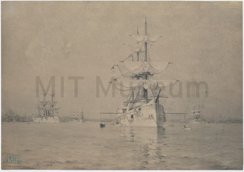Great White Fleet, U.S.N. about 1885-'98 - at Anchor. Photograph of a painting depicting several large steam-and-sail gunships at anchor, with …