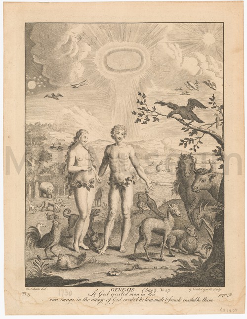 Genesis, Chap. I, v. 27. Engraving of Adam and Eve in the Garden of Eden, with fig …