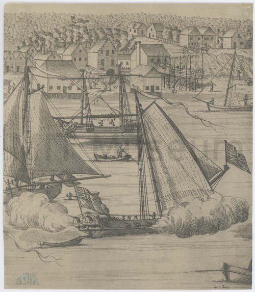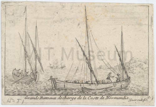 Grands Batteux decharge de la Coste de Normandie. Engraving depicting two double-masted vessels on the water with a coast in …