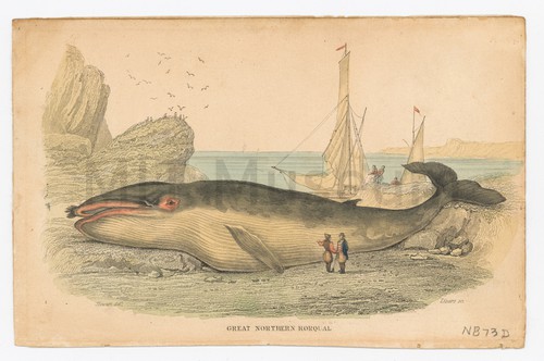 Great Northern Rorqual Colored engraving of a Great Northern Rorqual that is beached. Two talking …