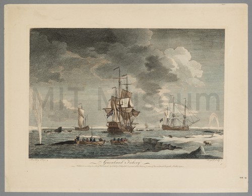 Greenland Fishery Hand-colored scene of the Greenland whale fishery. Foreground left, two whaleboats in …