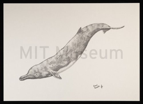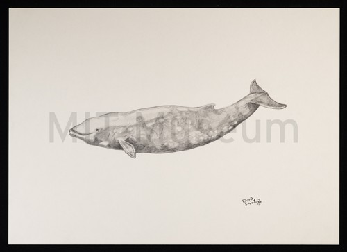 Goose-Beaked whale Monochrome print depicting a whale in side view; artist signature at lower …