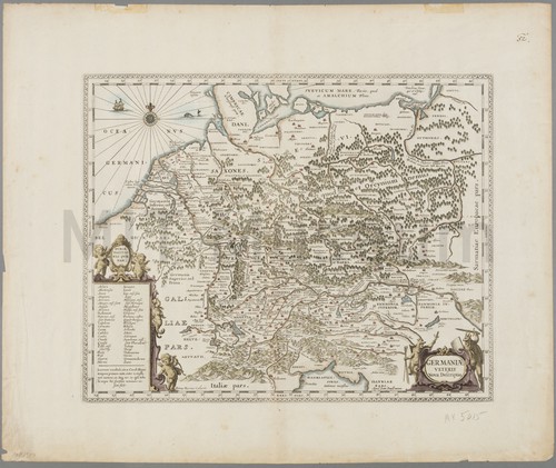 Germaniae Veteris Nova Descriptio Hand-colored copperplate map of the densely forested region between the Gaul to …