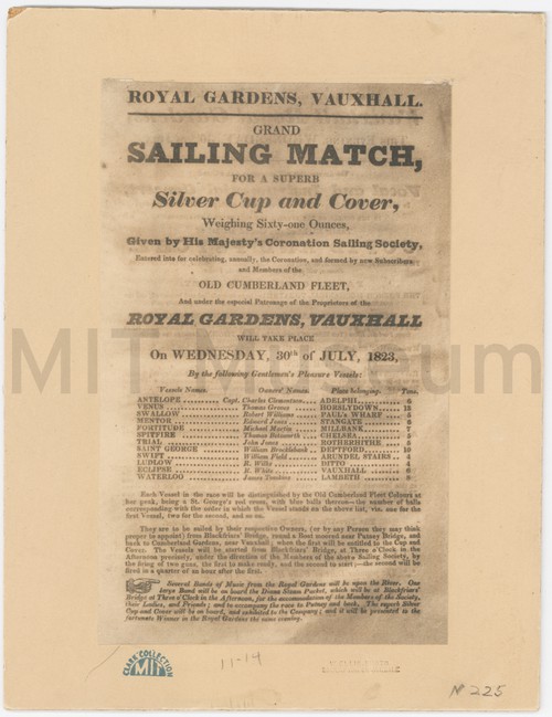 Grand Sailing Match, for a superb Silver Cup and Cover, weighing Sixty-one … Photographic reproduction of a 1823 advertisement for the Vauxhall Cup sailing match, …