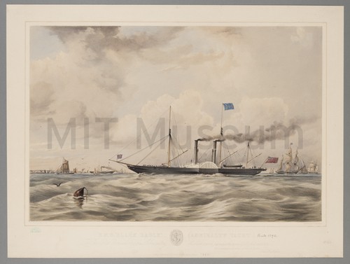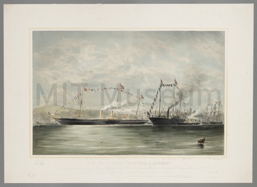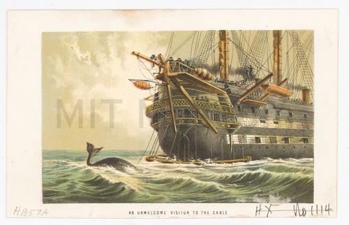 H.M.S. Agamemnon laying the Atlantic Cable in 1858, a Whale crosses the … Colored print depicts a view of the Agamemnon, a second-rate ship of …