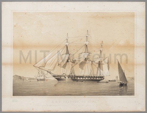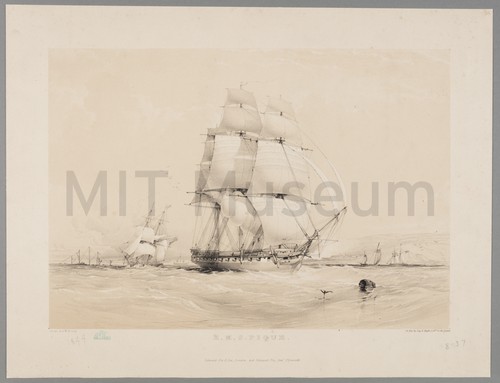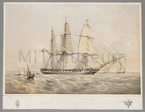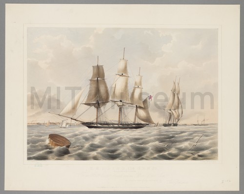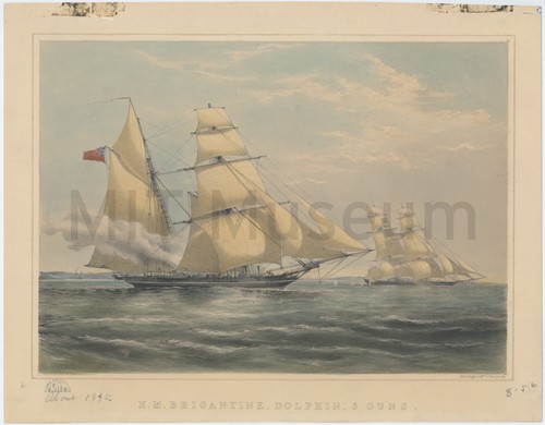 H. M. Brigantine "Dolphin" 3 Guns Hand-colored lithograph depicting the brig "Dolphin" in side view, with other vessels …