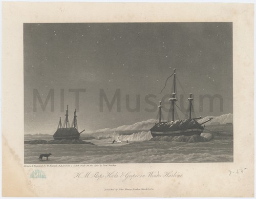 H. M. Ships "Hecla" & "Griper" in Winter Harbour Uncolored Arctic scene with two vessels on the ice and the stars …