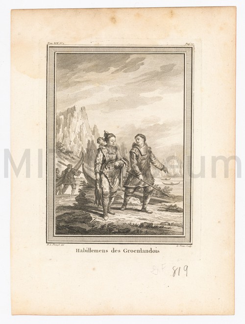Habillemens des Groenlandois Black and white engraving of Greenland natives. A couple is depicted returning …