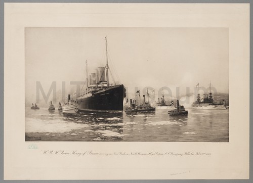 H. R. H. Prince Henry of Prussia arriving in New York on … A view of a large ocean liner heading toward the viewer surrounded …