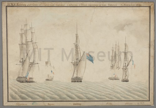 HMS Solebay of 32 guns S. Poyntz Esq. Captain Capturing a French … An original watercolor painting of the British capture of four French ships, …